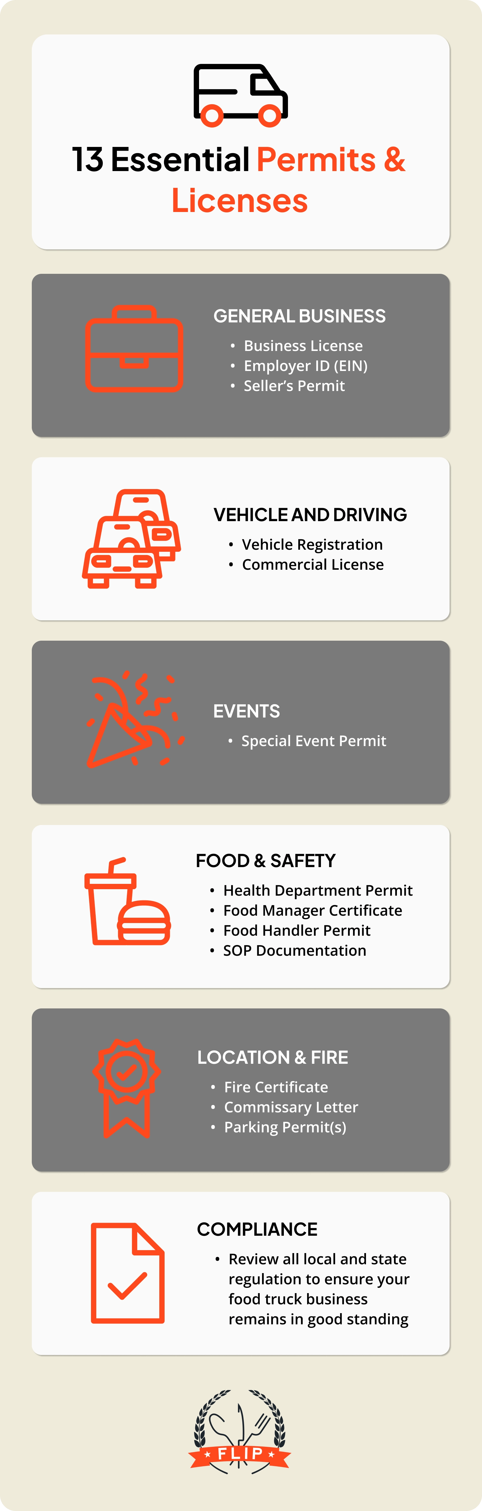 TL;DR: While exact requirements vary by state, county, and/or city, there are 13 licenses and permits most food trucks need to operate legally.