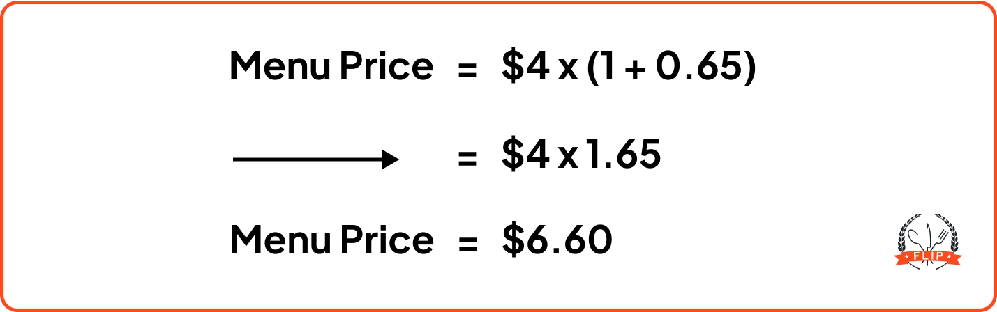 If the total cost to produce a dish is $4, and your target profit margin is 65%, your calculation would look like this:
