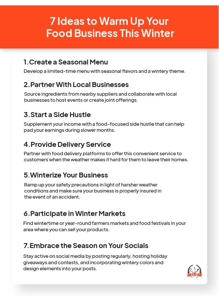 - Offer a catering service: Winter holidays mean corporate parties, big family gatherings, and other large events filled with hungry people. Identify items that transport well or can be made in large batches, develop a winter catering menu, and start catering events during the colder months.