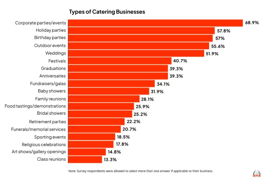Corporate parties are the most popular type of event for catering businesses, with 68.9% of survey respondents selecting this category.