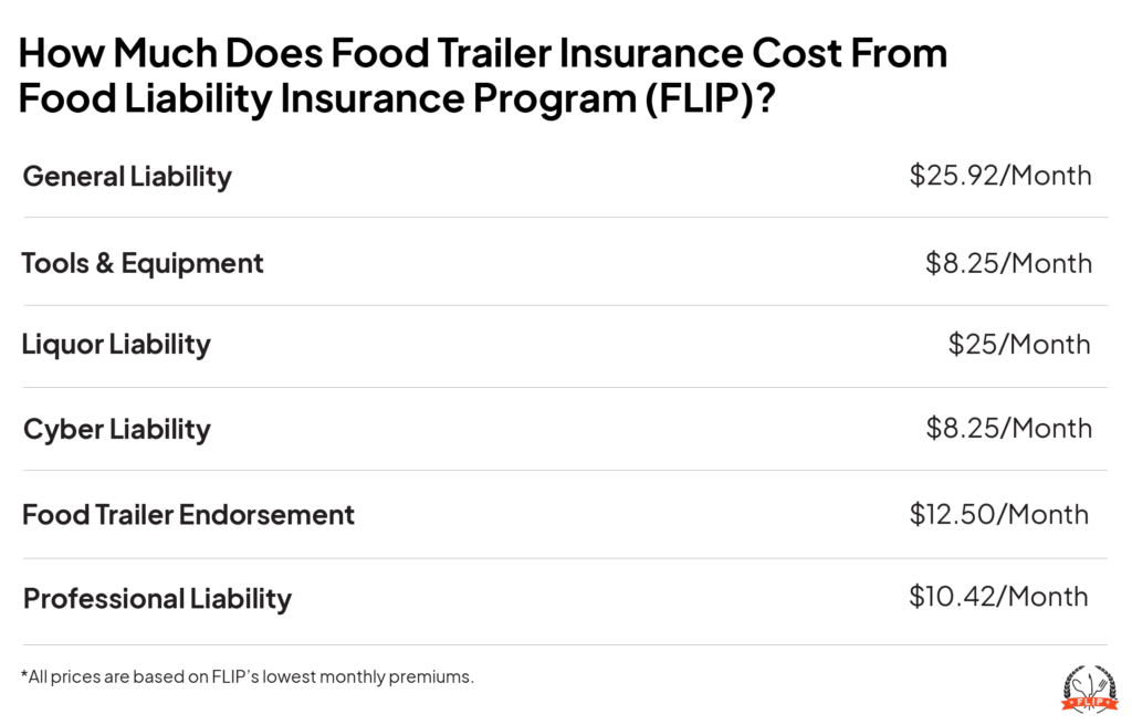 Food trailer insurance starts at $38.42 per month. This price includes our base general liability policy, which starts at $25.92 per month, plus our exclusive food trailer endorsement at $12.50 per month.