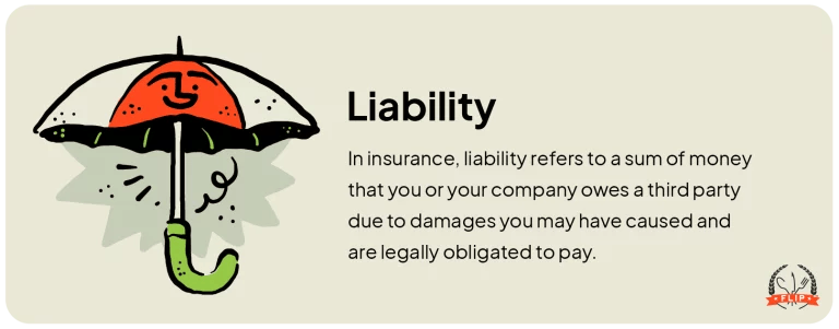 In insurance, liability refers to a sum of money that you or your company owes a third party due to damages you may have caused and are legally obligated to pay.